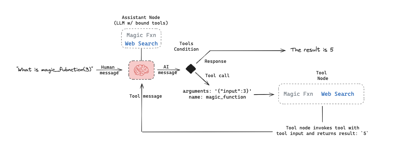 Below is a tool-calling agent in LangGraph. The assistant node is an LLM that determines whether to invoke a tool based upon the input. The tool condition sees if a tool was selected by the assistant node and, if so, routes to the tool node. The tool node executes the tool and returns the output as a tool message to the assistant node. This loop continues until as long as the assistant node selects a tool. If no tool is selected, then the agent directly returns the LLM response.