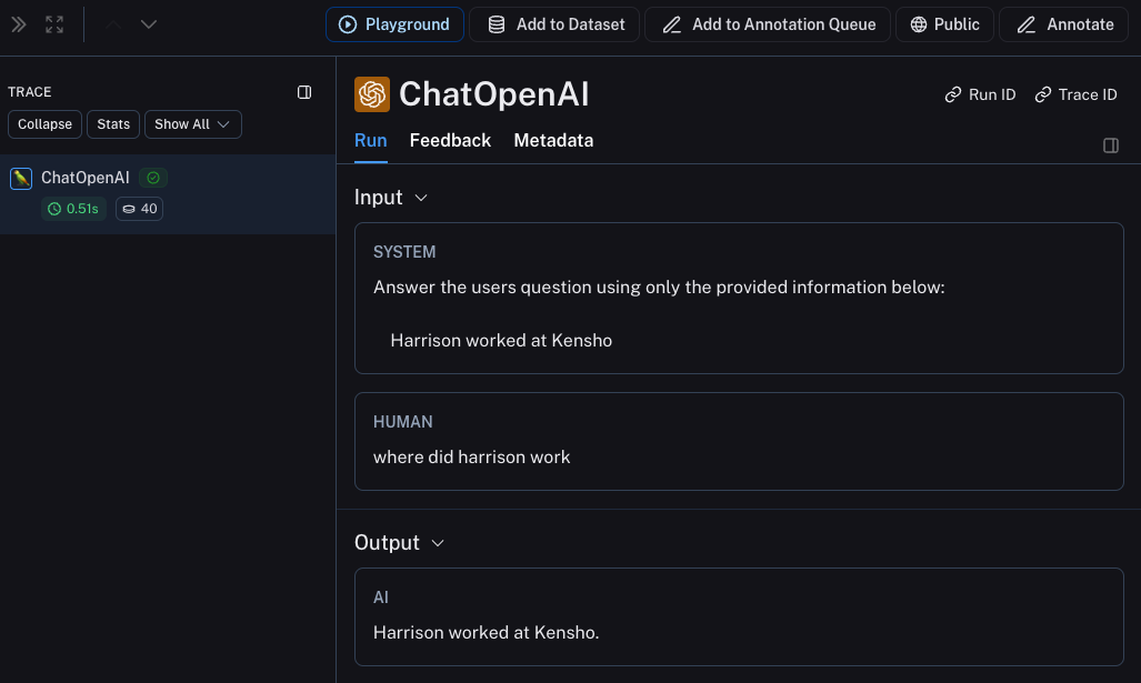 This will produce a trace of just the entire pipeline (with the OpenAI call as a child run) - it should look something like this
